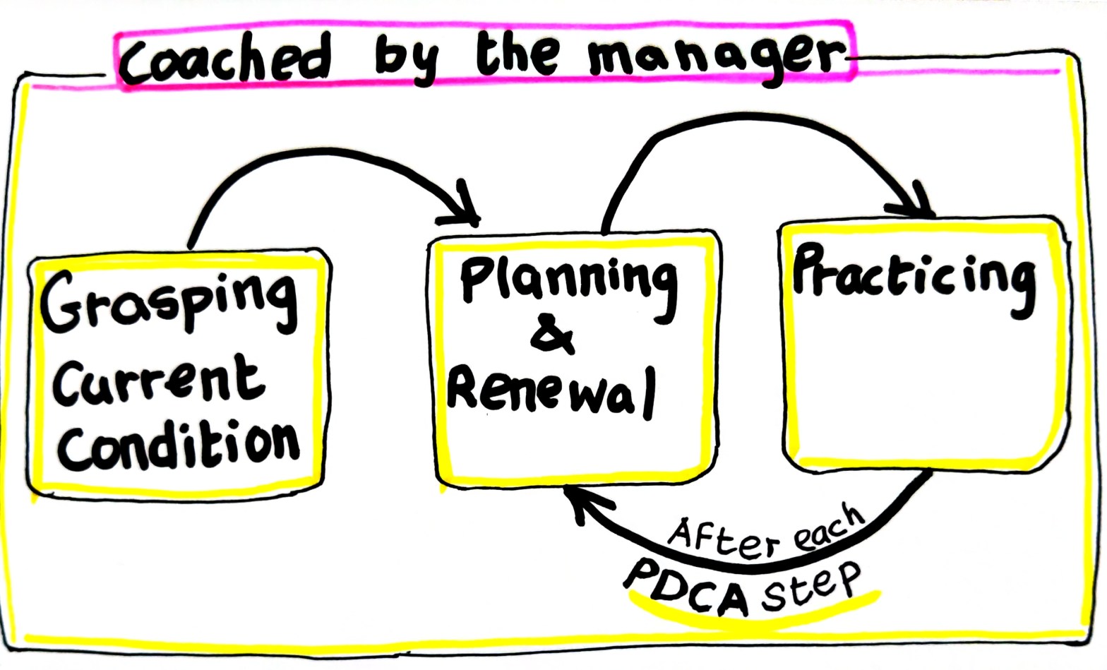 Toyota Kata has its way of doing this natural way of work, by following the next 4-steps.