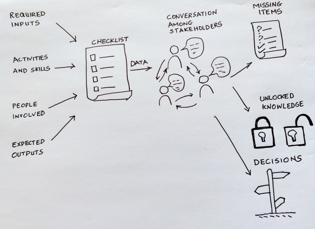 Rather than implementation, introducing a checklist involves experimentation; a checklist represents a future-state that teams experiment towards it. Checklist requires new level of interactions when doing the work, because it makes assumptions explicit. The benefits however to the teams are discipline, team-work, and humility to change their mind in face of errors. These behaviors are needed in face of complexity and inevitable failure.